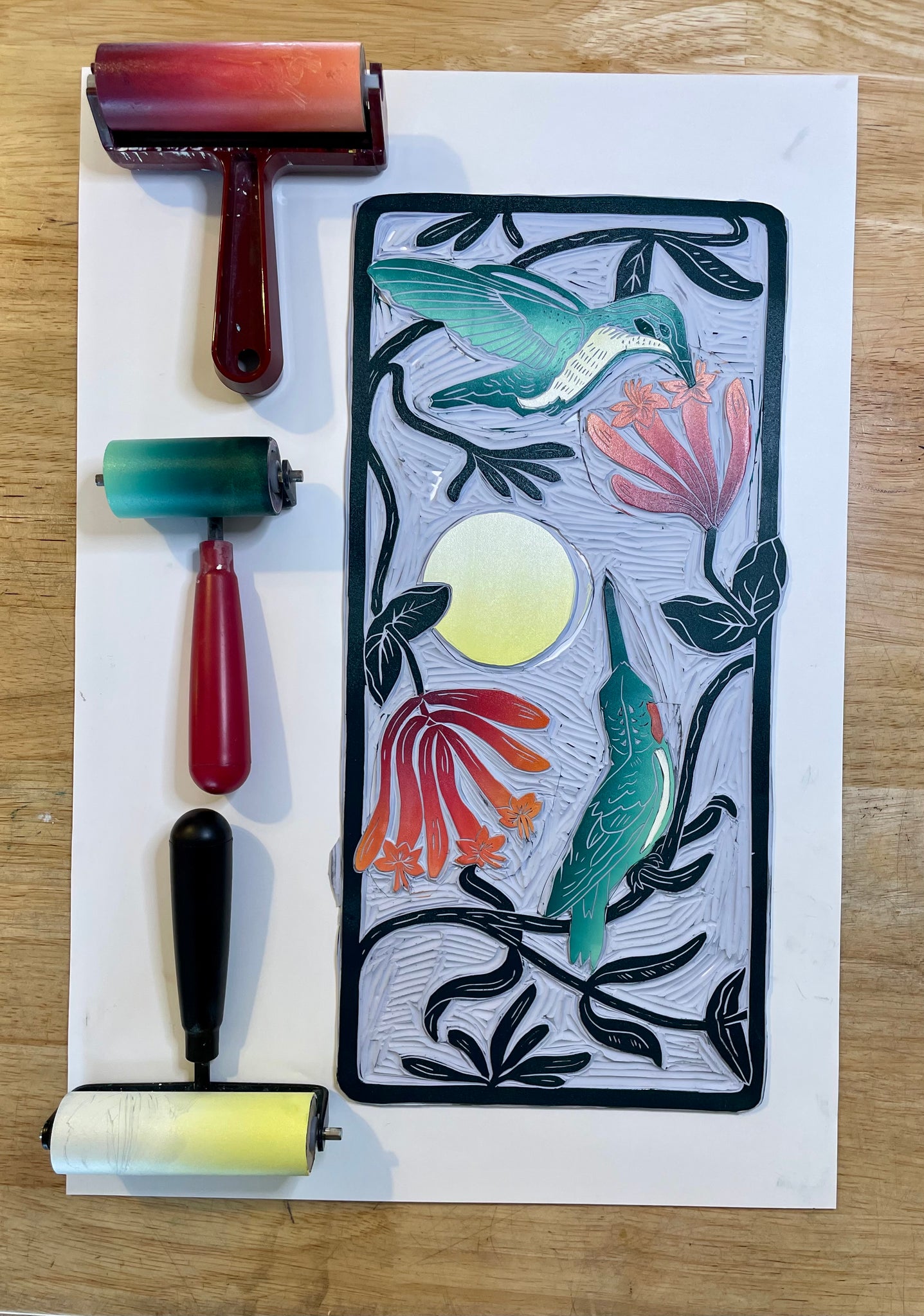 "Hummingbird Sunrise" features a male ruby throated hummingbird gazing up at a female who is feeding from a native coral honeysuckle. When creating this design, I took inspiration from the migration of the hummingbirds up the east coast every spring. Each full color block is hand inked and pressed, so each one turns out slightly differently.